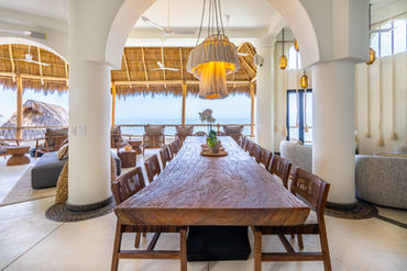Elevate your dining experience at the heart of our home, where open-air panoramic dining awaits, offering breathtaking views of the bay. Nestled amidst various lounge areas, our magnificent Mexican hardwood table beckons, comfortably accommodating up to 16 guests for unforgettable gatherings and cherished memories.