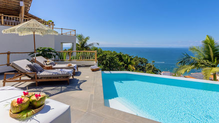 The Grand Sal, the casa's core, is a vast Living Room with diverse seating for over 40 guests, boasting stunning views of Banderas Bay and Puerto Vallarta. Its thoughtful design allows for comfortable, simultaneous relaxation in multiple cozy areas without feeling overcrowded.